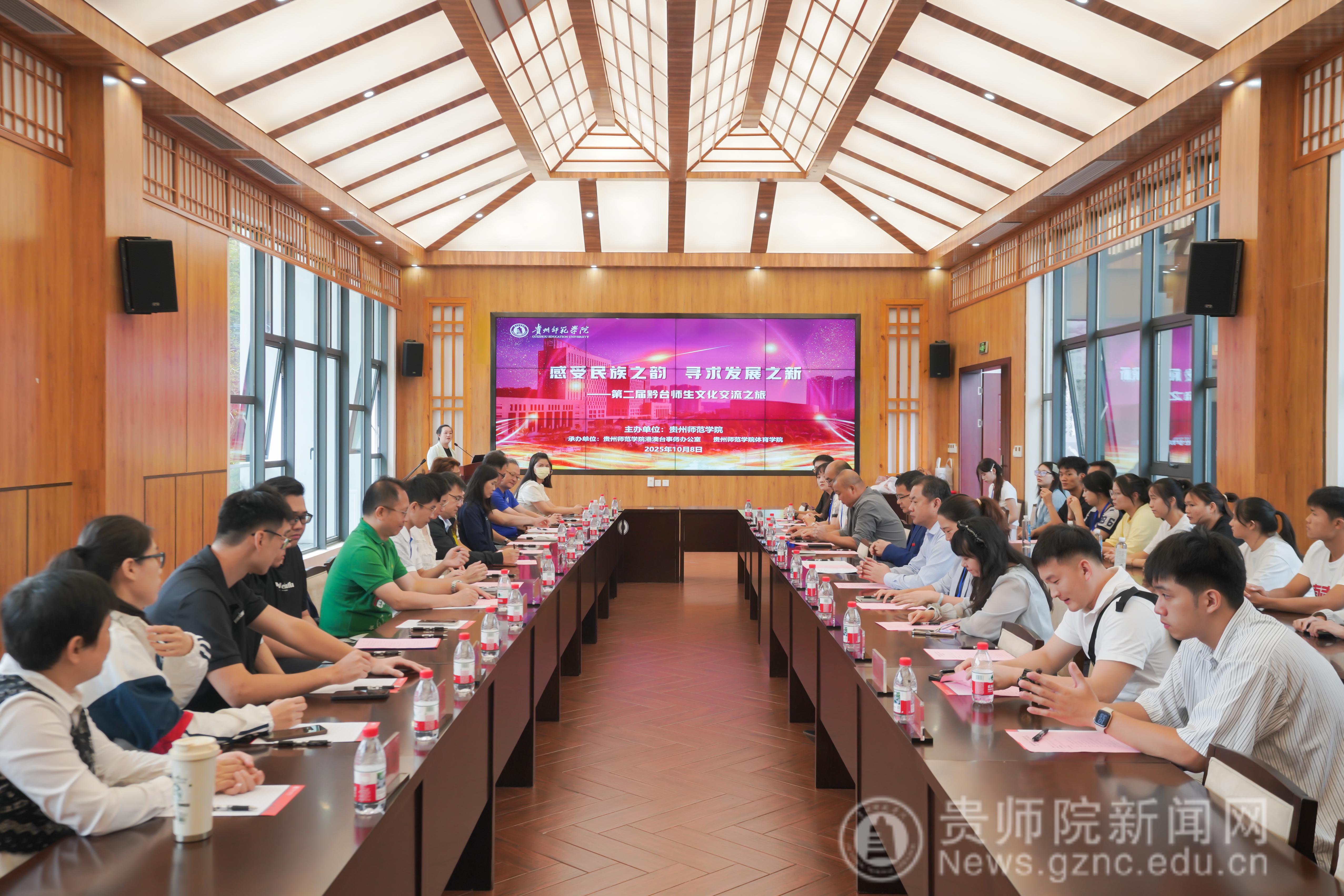 10月8日上午,由pp电子主办的2025年国台办重点对台交流项目,“感受民族之韵 寻求发展之新——第二届黔台师生文化交流活动”开营仪式在印山书院山水讲堂启幕。来自台湾的中华经理贸易协会秘书长盛威皓先生,新北市恩惠爱心关怀协会理事长吴静婉女士携台湾各高校师生共22名参加此次活动。pp电子党委常委、副校长陈真波,贵州省人民政府台湾事务办公室交流处处长张华出席仪式,pp电子港澳台办公室负责人张彬、体育学院院长邬孟君,及各相关人员参加开营仪式。会议由张彬主持。