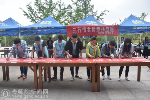 为确保活动顺利开展,图书馆读者协会成员做了大量前期准备工作,包括活动策划、活动场地申请、宣传海报制作与张贴,联系书商赠书事宜等。4月18日至19日,读协成员们布置场地,搬图书、摆奖品、搭帐篷、拉横幅,放展板……准备工作井然有序。中午十一点,活动正式开始。“世界读书月”系列活动形式多种多样,包括“图书赠送”(新知专业图书有限责任公司)、 “移动图书馆数字资源推送”、 “超期图书免费回家——图书馆滞纳金赦免活动”、“捐书”、“图书交换”、“好书推荐”、“阅读便利贴<贴心愿墙>”、“今天我荐书”、“玩转图书馆——阅读、学习、我问、你答”、“横幅签名”、“经典诵读”、“三行情书作品展”、 “2017图书馆利用将星公示”、“‘三行情书’获奖公示”、“‘与经典同行’获奖公示”、“‘信息检索素质教育’优秀助教公示”、“毕业论文答疑解惑”等,并与乌当区图书馆合作推出“一封家书”、“金话筒全民朗读大赛”活动,受到读者的热烈追捧。并于活动当天下午邀请周复刚教授在大业青藤咖啡文化中心与同学们现场分享自己人生的“阅读马拉松”,丰富了阅读活动的内容与形式。读者只要参加图书馆阅读推广系列活动,便能领取图书一本或纪念品一份,同时获得图书滞纳金赦免特权。全校师生踊跃参与活动,截止至当天下午四点,共送出图书七百余本,礼品三百余份,赦免25位读者图书滞纳金。千名师生参与活动,亲身感受和体验图书馆的海量数字资源及新技术新服务。“世界读书月”系列活动得到了广大师生的积极响应和高度评价。