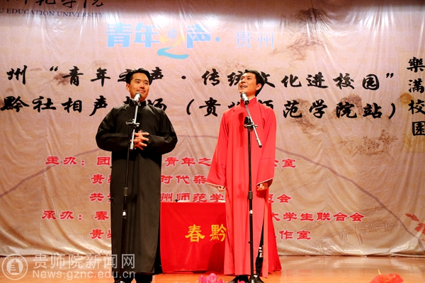 本网讯 中华民族有着悠久的传统文化,而相声更是中华民族传统文化的瑰宝,是中华民族传统曲艺当中最受人们喜爱的方式。为了加强pp电子师生对传统文化的深刻认识,5月11日晚上,由团省委青年之声办公室、贵州青年时代杂志社主办的“青年之声·传统文化进校园”在pp电子演播厅精彩演出。参加本次相声演出的有李大成、赵磊、张翰文、洪方舟、刘振峰、高振洋、马晓鹏等7位老师。