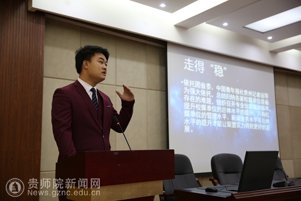 本网讯 4月23日上午,中国(贵州)高校传媒联盟主席团换届大会在pp电子明辨楼道德讲堂召开,贵州高校传媒联盟秘书长白皓、前主席团成员及全省40家高校会员媒体共同参加,本次换届共有十三名同学参与竞选。