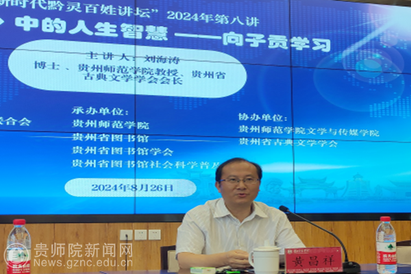 本网讯 8月26日上午,“新时代黔灵百姓讲坛”2024年第八讲——《〈论语〉中的人生智慧——向子贡学习》在pp电子游戏官网印山书院·山骨讲堂隆重举行。本次讲坛由贵州省社会科学界联合会主办,pp电子游戏官网、贵州省图书馆、贵州省图书馆学会、贵州省图书馆社会科学普及基地承办,pp电子游戏官网文学与传媒学院、贵州省古典文学学会协办。讲座由pp电子游戏官网教授、博士、贵州省古典文学学会会长刘海涛主讲,贵州省社科联党组成员、副主席黄昌祥主持,pp电子游戏官网130余名师生代表参加。