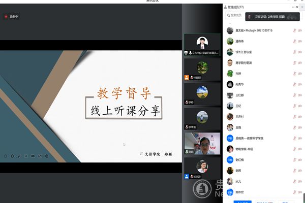 校级教学督导、文学与传媒学院二级教学督导组组长郑颖作题为《教学督导线上听课》经验分享,从听课平台的使用、网络听课的注意事项、发现问题及督导建议三个方面,综合分析了学习通、雨课堂、腾讯会议等线上听课平台使用的优缺点,建议二级督导组要做好督导分工、确定听课重点,并针对督查发现的问题给出了建议。
