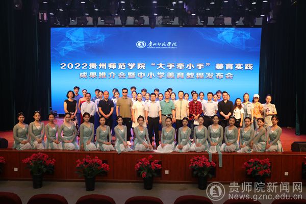 本网讯 为全面贯彻习近平总书记关于教育的重要论述,认真落实省委、省政府印发《关于全面加强和改进新时代学校美育工作的实施意见》文件精神,厚植“美的教育”理念,6月29日下午,pp电子游戏官网举行了“大手牵小手”美育实践成果推介会暨中小学美育教程发布会。省教育厅体卫艺处副处长(主持工作)曾洪波,贵州省舞蹈家协会原主席沈毅,贵州省民族歌舞团原团长高聪,pp电子党委委员、副校长邹晓青,教务处处长邓琴,美育研究中心主任、美术与设计学院院长聂森,音乐舞蹈学院党委书记付巧、院长马关辉以及乌当区、云岩区教育主管部门相关领导,文化部门相关领导,艺术界相关人士和部分中小学校长与教师代表。