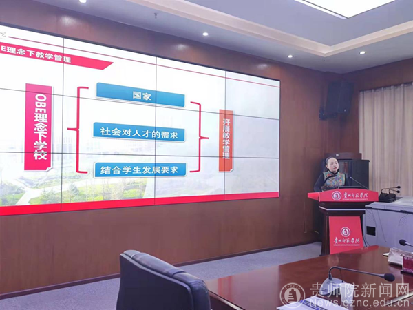 首先,邓琴分别从校级层面和二级学院层面解读基于OBE理念下的教学管理理念。她提出,校级层面从教学质量目标管理、教学资源管理、教学过程管理和教学质量监测分析和改进管理等四个方面着手进行管理;二级学院则要围绕教学目标职责与管理、教学资源建设与管理、教学过程实施与管理、教学质量监控与改进、学生服务与指导等五个方面,结合国家和社会对人才的需求、学生发展要求及学校人才培养目标定位来开展学院层面的教学管理,并就每一个管理模块下的详细措施提出了总体思路和要求。同时,就教学常规运行、专业建设与课程建设、实践教学和实验室管理等对近期教学工作情况进行了通报,并安排下学期开学前相关工作,着重强调了期末排考、成绩录入、人才培养方案修订、实习实践等工作。