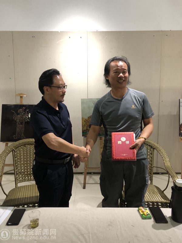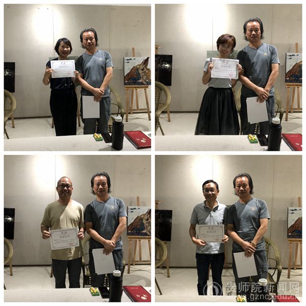 典礼仪式上,首先由聂森院长致辞,对江书荣老师近一个多月的辛苦表示衷心的感谢,对老师们利用暑假时间参与学习培训给予了高度肯定,并指出漆画艺术具有贵州地方特色,作为贵州三宝之一的大方漆器,早已享誉国内外,我们可以利用好漆画艺术的地方性和独特性,通过培训掌握好漆艺的技法,积极参与到乡村文化振兴的发展过程中。同时,推动我院教师队伍的创作能力和创作水平的提高,还能突出我院人才培养领域的特色和亮点。并表示学院以后将全力支持教师参与到漆画创作中。另外,期盼江老师一如既往地支持我院漆画人才队伍的培养,更期望我院漆画教师队伍能够学好漆画这个画种,将漆画艺术参与到学院学科建设,推动学院学科、科研与艺术创作同步有序健康发展。