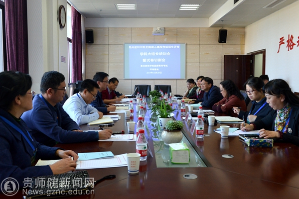 本网讯 10月29日下午,贵州省2019年10月成人高校考试招生网上阅卷学科大组长培训会暨试卷切割会在pp电子游戏官网国家教育考试评卷基地召开。贵州省招生考试院成招处处长黄克勇、pp电子游戏官网评卷基地办公室负责人赵德肃、何荣,pp电子游戏官网各学科阅卷大组长出席会议。会议由pp电子游戏官网评卷基地办公室主任、继续教育学院院长赵德肃主持。