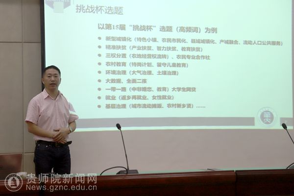 本网讯 5月17日,由团省委学校部主办,pp电子游戏官网团委、创新创业学院承办的第十六届“挑战杯”贵州省大学生课外学术科技作品竞赛专题培训会在pp电子游戏官网圆满结束。本次培训会邀请到了第十五届大赛国赛特等奖指导教师华中师范大学教授戴胜利、陈淑云,第十五届大赛省赛评委罗以洪,第十五届大赛省赛一等奖指导教师pp电子游戏官网副教授杜宏博,他们分别从科技发明制作类、哲学社会科学调查报告及论文类的选题、团队组织、答辩等方向对来自全省32个高校的91名竞赛负责人和指导教师进行了辅导。