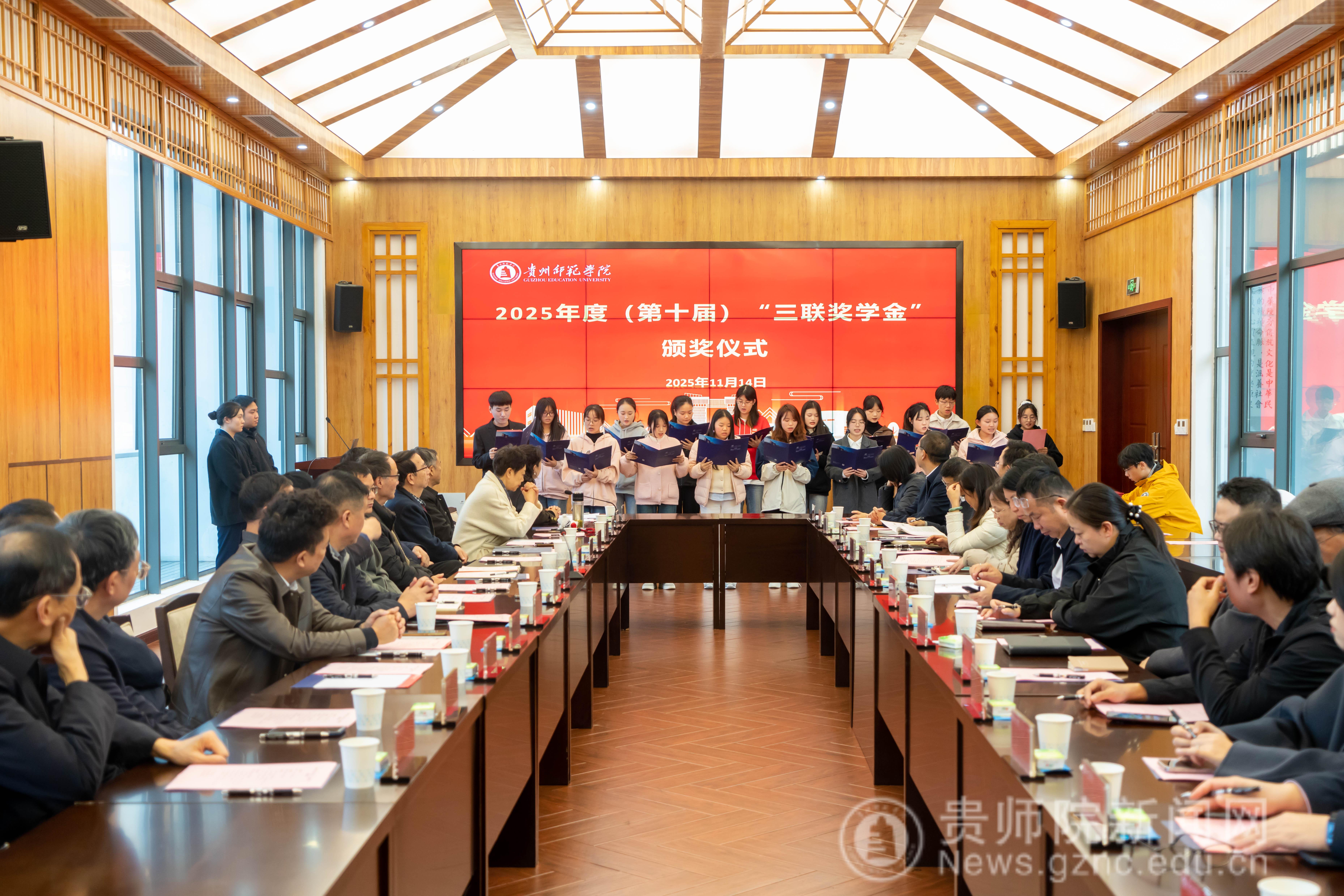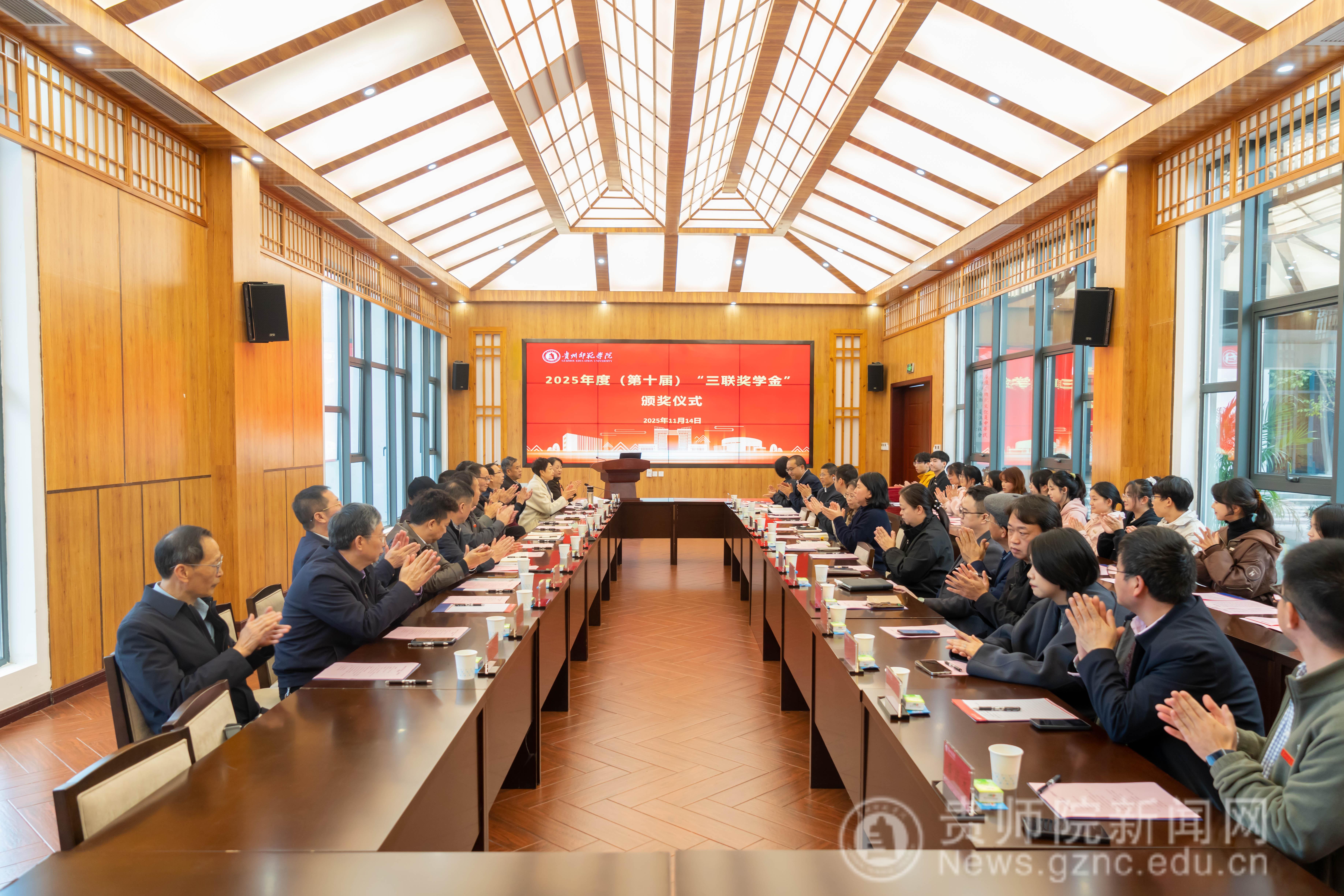 本网讯 11月14日,pp电子游戏官网2025年度(第十届) “三联奖学金”颁奖仪式在印山书院山水讲堂隆重举行。学校原校长、贵州省pp电子游戏官网校友会会长郁钟铭,pp电子游戏官网党委常委、副校长陈真波,贵州三联教育集团董事长、校友会副会长肖开玉等一行嘉宾,各二级学院党委书记和老师,以及16名获奖学生参与。仪式由校友办主任敖永凤主持。