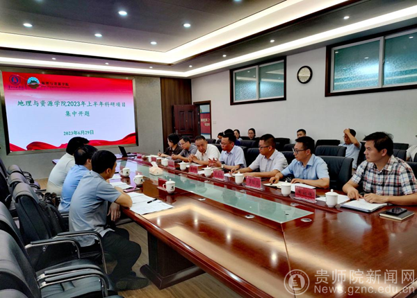 本网讯 6月29日,地理与资源学院2023年上半年科研项目集中开题专家评审会在学院会议室举行。校党委副书记熊世桓教授、校科研处处长罗光杰教授出席会议并讲话,贵州科学院山地资源研究所的苏维词研究员、中国科学院地球化学研究所的白晓永研究员、贵州师范大学喀斯特研究院的蓝家程教授等三位专家出席会议并做指导,地资学院班子成员,相关项目负责人及项目组成员参加会议。会议由学院院长罗绪强教授主持。
