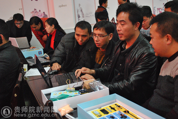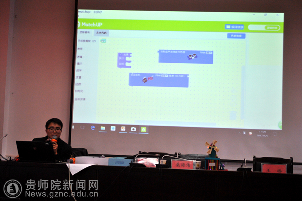 pp电子教师作了题为《贵师院大学生信息技术创新创业成果及创客教育》专题报告,创客教师王桥、桑海伟在pp电子学生助教的配合下,通过“造物盒子”这一创客工具指导参训教师制作了创客作品。