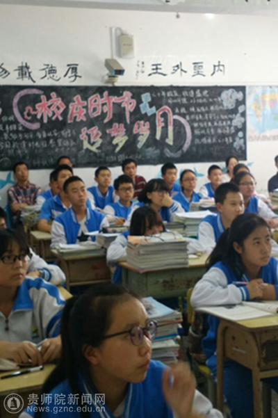 实习生李凯文是2013级历史学专业的同学,现在乌当中学实习,在乌当中学实习指导老师汪强的安排下,中国史教研室老师们观摩了该同学所上的高一历史必修一的第九课《资本主义政治制度在欧洲大陆的扩张》课程,40分钟的课堂教学,按照传统教学模式展开,节奏紧凑,该同学对教学内容比较熟悉,看得出来是做了精心的课前准备,与学生的互动较密切,教学内容能与现实进行联系,能调动学生的学习兴趣,总体来看,是一次较为成功的课堂教学。