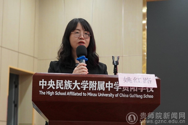 下午,中央民族大学附属中学贵阳学校党委委员、副校长彭冠雄,做“拥抱能者为师的时代”的主题发言。他阐述了学校作为随时代演变而发展的客观实体,是连接教育的过去与未来的重要载体,揭示了未来教育“能者为师”的教师职业特质。中央民族大学附属中学贵阳学校思政课教师胡红做展示课,题目为“寻根·铸魂·破题·传薪——从贵州特色文化中汲取文化自信的力量”。