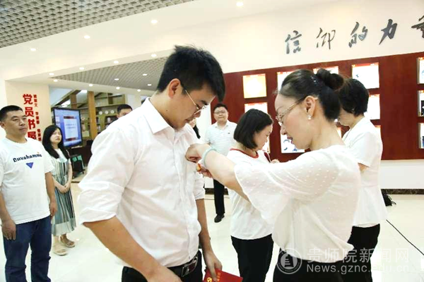 任洁为新党员佩戴党徽