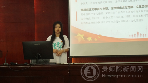 宣讲团成员严君怡围绕“中国人的文化自信”这个主题进行宣讲,通过宣讲让同学们更加深层次的理解 “求木之长者,必固其根本;欲流之远者,必浚其泉源”的道理。作为新时代青年,我们要深刻学习民族历史文化知识,拓展民族文化底蕴,做好新时代文化传承的接班人,要在创造性转化和创新型发展当中树立和增强文化自信,我们只有对自己的文化有坚定的信心,才能获得坚持坚守的从容,鼓起奋发进取的勇气,焕发创新创造的活力。