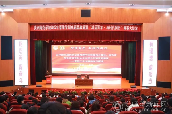 第一堂思政课——创新理论催化奋斗动能。3月30日,学校邀请中共贵州省委党校(贵州行政学院、中共贵州省委讲师团)宣讲教研处副处长史亮到校举行“对话青年,与时代同行”青春大讲堂。史亮老师以“以中国式现代化全面推进中华民族伟大复兴,奋力谱写全面建设社会主义现代化建设新篇章”为主题,从深刻领会党的二十大的重大主题、牢牢把握过去五年工作和新时代十年的伟大变革的重大意义、习近平新时代中国特色社会主义思想的世界观和方法论、以中国式现代化全面推进中华民族伟大复兴的使命任务、未来五年全面建设社会主义现代化国家的战略部署等五个方面进行了详细解读,系统地阐述了党的二十大在政治上、理论上、实践上取得的一系列重大成果,引经据典、旁征博引、以古鉴今、深入浅出地给大家上了一堂生动形象的思政课,对全体在座师生深刻领悟党的二十大报告的核心要义和精神实质,凝聚思想共识,强化使命担当有着重要启发作用。山河虽无恙,吾辈当自强。本次专题讲座激励全校青年教师和青年学子统一思想、凝聚力量、振奋精神、坚定信心,为立志做有理想、敢担当、能吃苦、肯奋斗的新时代好青年努力奋斗。大家深刻认识到中国式现代化离不开每个青年的努力奋斗,新时代青年要切实增强学习贯彻党的二十大精神的思想共识和行动自觉,进一步提高政治站位,以朴实坚韧的勇气和魄力,做新时代、新征程上的积极行动者和热忱付出者,以青春之笔绘就奋斗蓝图。