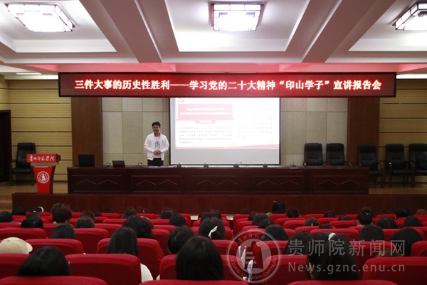 本轮宣讲人严婧文、裴飞和黄桂振作为宣讲成员代表分别围绕“回顾中国特色外交历史,携手构建人类命运共同体”、习近平总书记在党的二十大报告中提到的十个典故、党的二十大报告中指出的“三件大事”的历史性胜利,这三个不同的视角向青年学子作宣讲报告,让同学们更加深刻领悟到要从新时代十年的伟大变革中进一步坚定历史自信,并纷纷表示将积极主动发挥自己的青春力量,努力从理论学习中汲取营养、坚定理想信念,向更多的人传递党的二十大精神,引导师院青年坚定理想信念,将自身发展更好的融入到中国特色社会主义事业中。