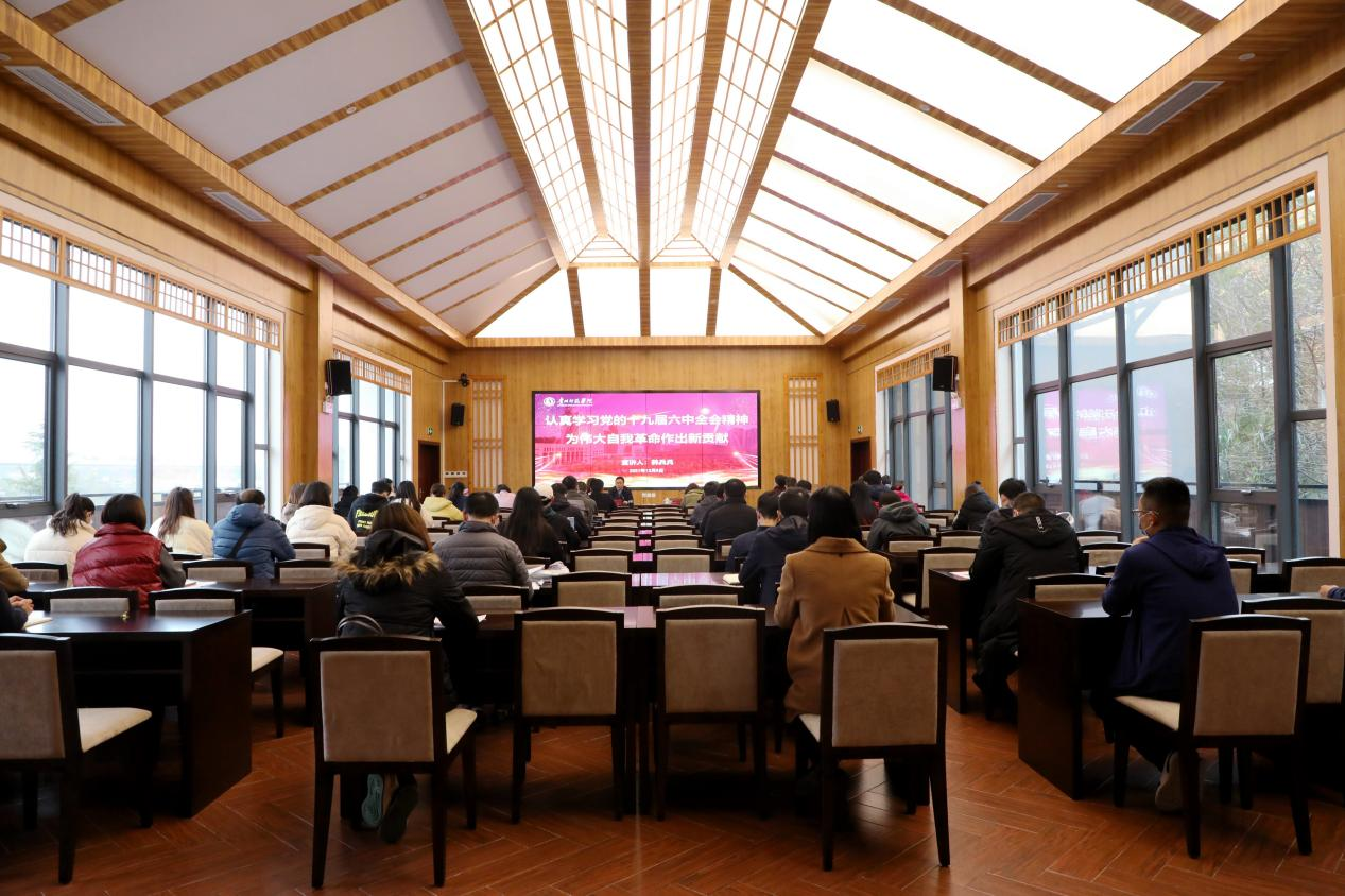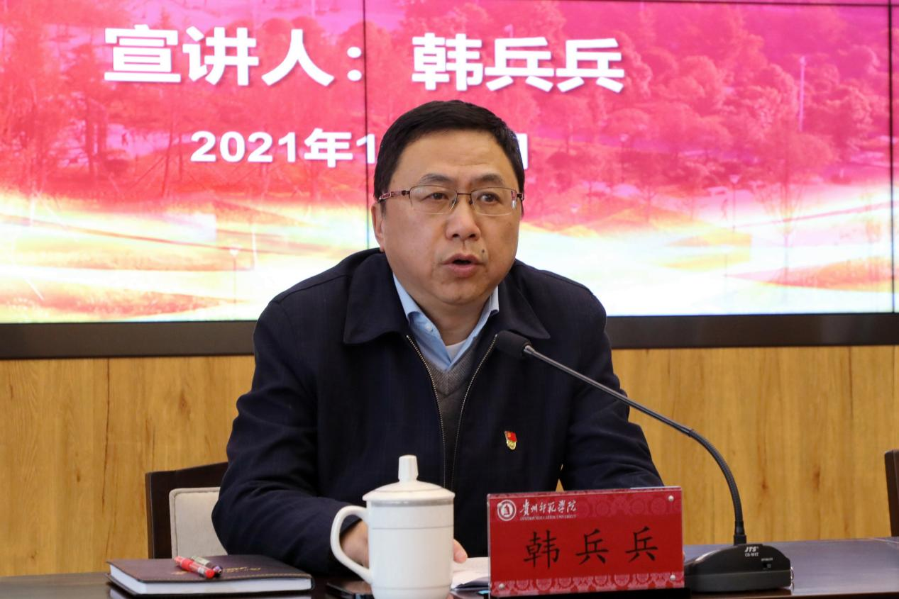 本网讯 12月8日,校纪委书记、省监委驻pp电子游戏官网监察专员韩兵兵在印山书院以《认真学习党的十九届六中全会精神 为新时代伟大自我革命作出新贡献》为主题,对党的十九届六中全会公报和《中共中央关于党的百年奋斗重大成就和历史经验的决议》(以下简称《决议》)精神,深入浅出地向全体纪检监察干部和音乐舞蹈学院教师党支部全体党员及2019级音乐学(一班)团支部同学开展学习贯彻党的十九届六中全会精神专题宣讲。