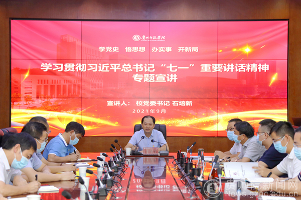 石培新要求,全校上下要切实把思想和行动统一到讲话精神上来,进一步深化用习近平新时代中国特色社会主义思想铸魂育人,广大青年学子要从用好庆祝建党百年这堂最生动的“大思政课”中汲取精神养分,立大志、明大德、成大才、担大任,把今天的学习成果转化为奋进新征程、建功新时代的实际行动,高标准高质量推动“七一”重要讲话精神落地见效。