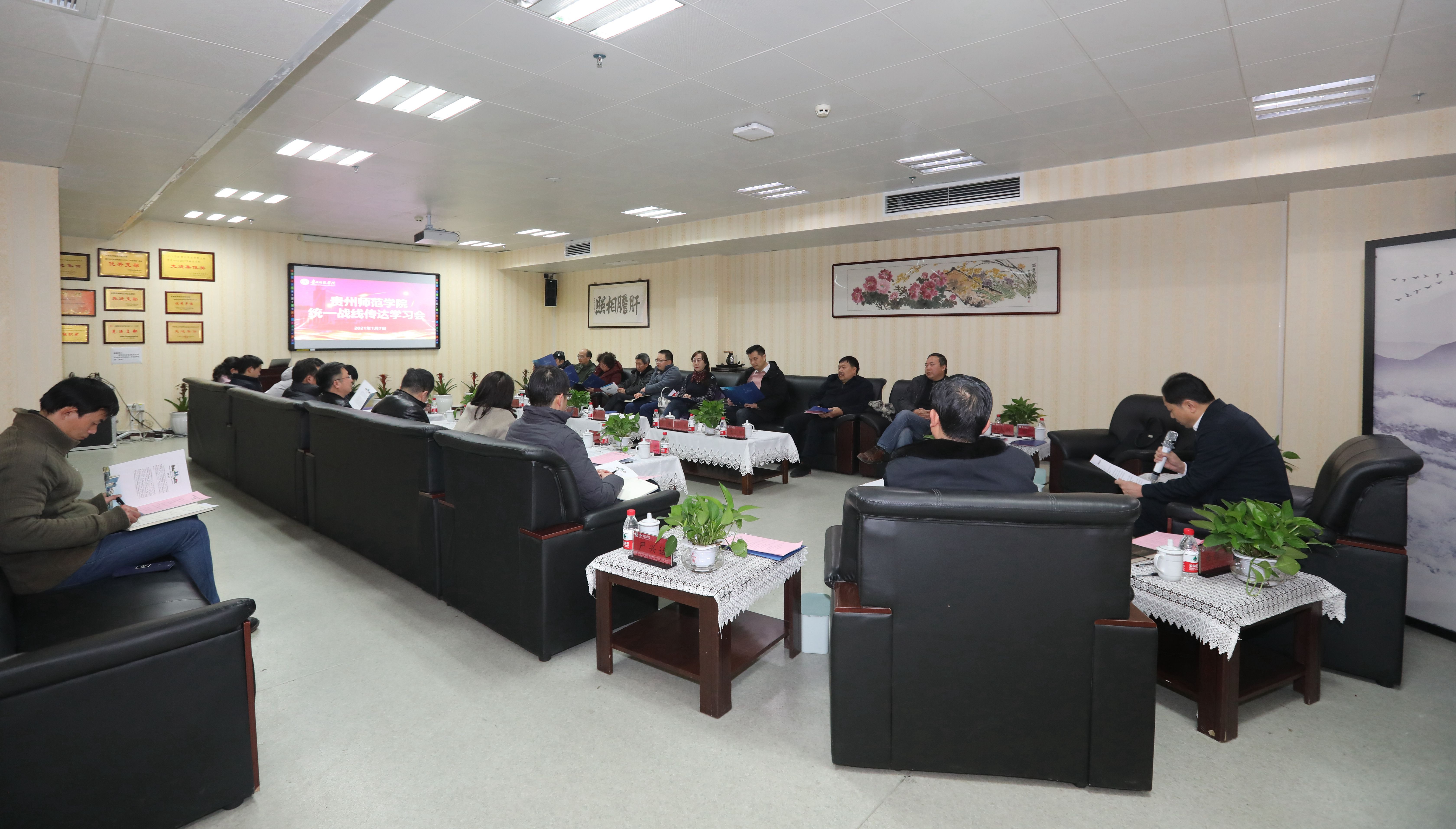 本网讯 为扩宽党外人士知情明政渠道,1月7日下午,pp电子在信息楼710统战之家会议室召开统一战线传达学习会,传达“习近平在全国政协新年茶话会上的讲话”和“中共贵州省委十二届八次会议公报”精神。校党委书记石培新、副校长余维祥、校党委副书记郭文出席了会议,会议由郭文主持。