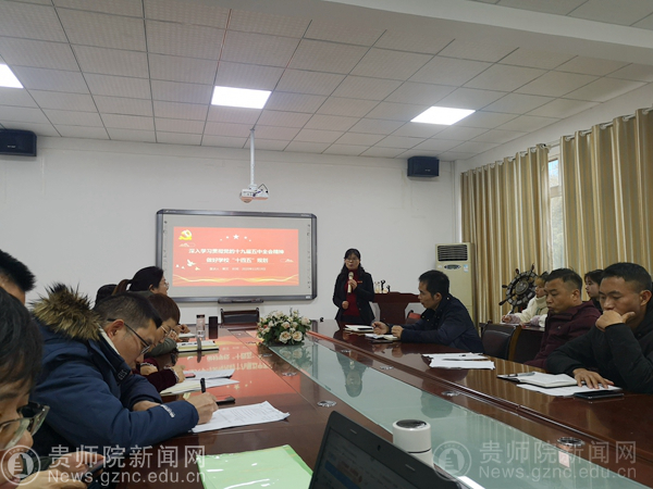 郭文从四个方面给大家讲解:党的十九届五中全会基本概况、党的十九届五中全会公报解读、以党的十九届五中全会精神为指引做好学校“十四五”规划、当前学校存在的主要问题。郭文讲授内容丰富,联系实际,充满激情,在讲到十三五取得的成就时列举贵州交通建设、扶贫攻坚、疫情防控、生态建设等方面的成绩,大家听了精神振奋;在讲到“十四五”规划和二〇三五远景目标时候,大家非常开心,对未来充满期待。全体党员表示要高举中国特色社会主义伟大旗帜,在以习近平同志为核心的党中央领导下,勇于担当,努力学习,认真工作。郭文以党的十九届五中全会精神为指引,结合学校实际情况,为大家讲了学校“十四五”规划的制定建议,强调要坚持立德树人根本任务,要为培养社会主义建设者和接班人不断提高自己的思想意识。同时指出了当前学校要进一步明确办学定位、进一步提高人才培养质量、进一步增强服务地方经济社会发展能力、进一步凝炼学校办学特色。