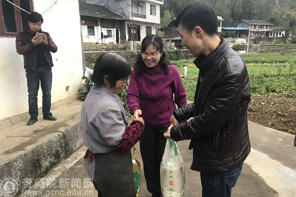 本网讯 11月22日,为扶贫工作持续推进、巩固提高、扎实有效,副校长郭文带领曾家坳村帮扶集团到印江县峨岭街道曾家坳村开展扶贫工作检查、问题调研和贫困户慰问等工作。随行调研和慰问的有教育科学学院党委书记彭祥友、商学院党委书记薛璞、科研处处长王平瑞、离退休工作处处长张四海,印江县峨岭街道办事处主任王芝豪参加座谈、陪同慰问。