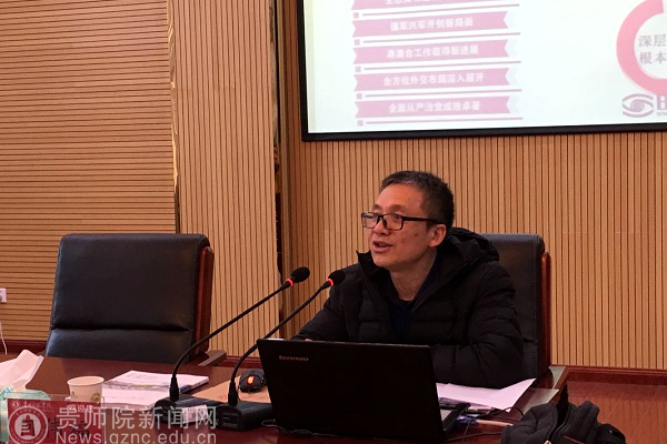 本网讯 12月25日,根据《贵州省委教育工委 教育厅关于<学习宣传贯彻党的十九大精神“七进”工作之进校园工作方案>通知》的要求,在逸夫楼艺术学院会议室,贵州省委教育工委高校马克思主义学院院长宣讲队成员、贵州财经大学马克思主义学院院长何伟福教授到pp电子宣讲党的十九大精神,马列主义教学部教师代表、经济与政治学院思想政治教育专业学生代表80余人参加了学习报告会,学习报告会由马列主义教学部负责人王天桥主持。