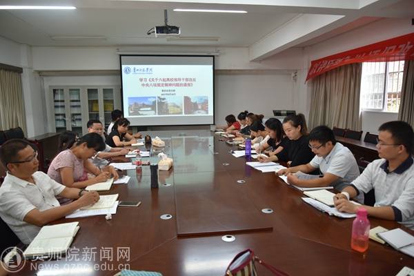 本网讯 9月25日下午,机关党委教务处支部在教务处会议室召开会议,传达学习了中共中央纪委《关于六起高校领导干部违反中央八项规定精神问题的通报》,纪检委员杨通槐传达文件精神,副校长郭文、教务处全体成员参加了会议。