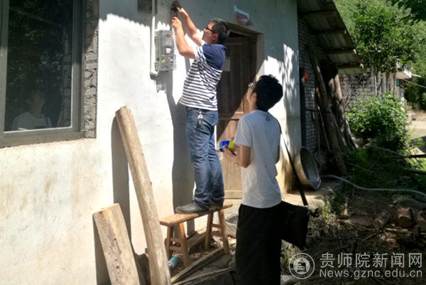 通过为期近3天忙碌,帮村里12户贫困户家里的老化线路重新安装。3位老师帮扶安装线路的3天,正至印江天气炎热,为了保证质量、节省经费,老师们不怕苦不怕累,手指扎破流血、满身蜘蛛灰尘、也不在乎。看到先前像牵蜘蛛网似的电线环绕屋子,像老化藤布满房间的老化电线没有了,贫困户们的安全隐患消除了,老师们感到由衷的高兴,