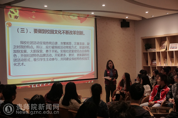 首先,社联主席王砚婷围绕“贵州省第十二届党代会”的基本内容、目的发表讲话,并表态作为一名学生干部,肩负着党和国家赋予的责任和使命,应努力结合自身实际,学习贯彻此次党代会所传达的精神。其次,各社团负责人代表纷纷分享自己的感悟和提出现在社团所面临的问题。甘于奉献、团结合作、脚踏实地是我们管理社团的基本原则,大家表示愿意以铁一般的行动,在清醒地认识到困难所在和自身能力后,为贵州、为党和国家的新未来出一份力。最后,王砚婷就调动人员物资,创意创新方面总结了本次座谈会。