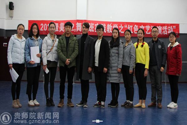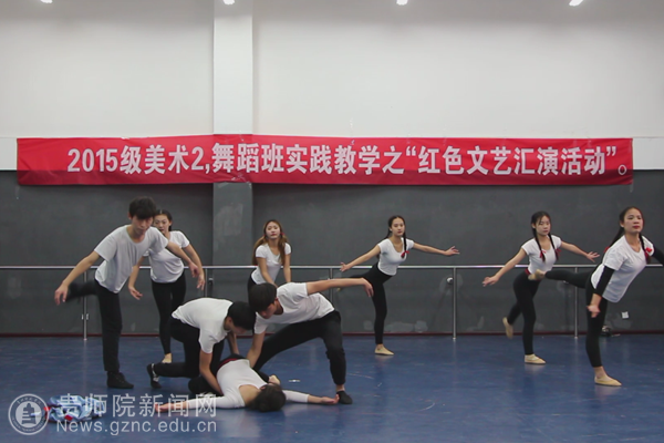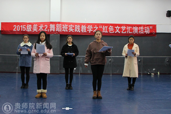 本网讯 为了增进大学生对红色历史文化的认识与体会、锻炼大学生的团队协作精神与动手能力以及凝聚师生、生生之间感情,结合课程教学实际,12月15日下午,pp电子艺术学院2015级美术二班和舞蹈班联合在艺术学院二楼舞蹈排练室(上半场)和逸夫楼601教室(下半场)联合开展了一场红色文艺汇演活动。该活动是《毛泽东思想和中国特色社会主义理论体系概论》课程实践教学的最后一个环节,在任课教师王维江的指导下,由王梅梅、周蕊和孙竣峰三个同学负责总体策划,由周蕊和孙竣峰同学担任主持人,由王梅梅、李晓沙、吴彬岚、徐维、邱春松和曹亚男六位同学担任评委,由记录班长李彩英同学负责记录,潘应才同学负责拍照。