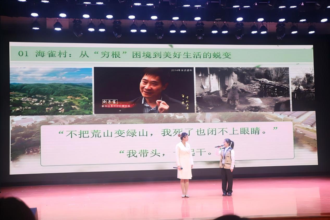 展示环节中,各校节目精彩纷呈,成为活动的最大亮点。来自小学、中学、高校的师生们围绕主题,分别呈现了各具学段特色的思政课建设成果。pp电子游戏官网马克思主义学院学生以情景宣讲方式讲述郭贵故事,结合中国式现代化阐释青年担当;以沉浸式情景剧再现海雀村蜕变,传递坚守与扎根信念;以宣讲+情景表演的方式演绎黄文秀扶贫事迹,彰显无私品格、体悟党员初心。贵阳市云岩区第一中学的学生以诗朗诵+情景演绎的方式,热情讴歌革命先辈精神,以“青春追光者”视角传递信仰力量、传承红色基因;贵州省实验中学的学生以激昂鼓点生动展现中华传统文化魅力,传递青少年朝气,诠释担当精神;新天九年制学校高新分校学生以庄严宣誓完成信仰接力,“红领巾心向党”传递少年传承红色血脉、勇担使命的决心。