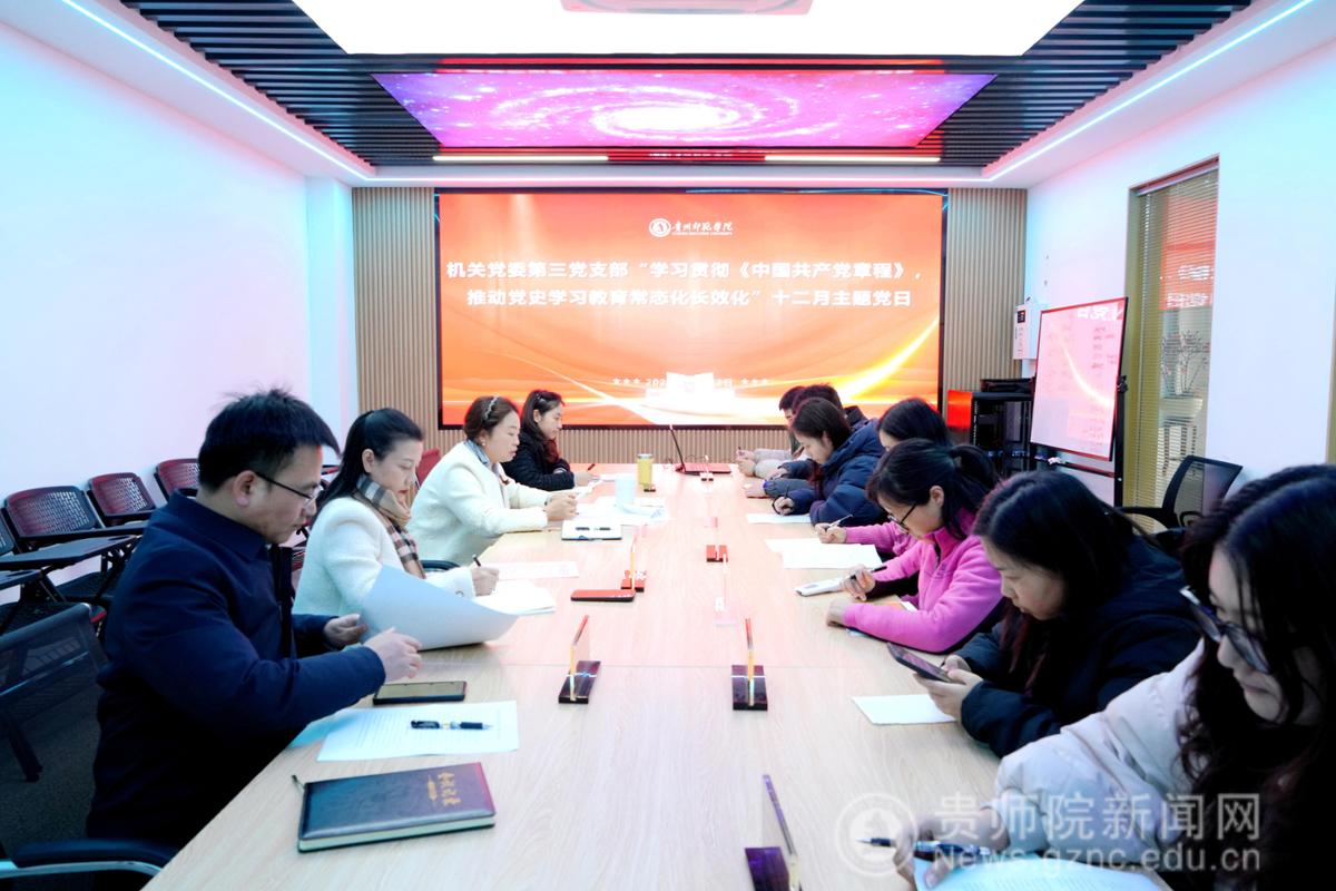本网讯 为牢固树立党章意识,持续巩固拓展党史学习教育成果。 12月23日下午,机关第三党支部在信息楼1507会议室开展主题为“学习贯彻《中国共产党章程》,推动党史学习教育常态化长效化”的主题党日活动。校党委副书记邹晓青以普通党员身份出席会议,支部党员同志参加会议,会议由党支部书记宋婷禹主持。