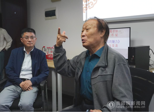 活动一开始,周先生首先强调:语言是最重要的人生工具,更是所有教师最重要的工作手段。良好的语言表达能力,是每一位合格教师的"刚需"。接着周先生从自己青年时期与书籍结缘的故事引入,分享了自己五十多年的教师生涯中,对如何提高教师语言经验和思考。他强调,对于即将踏入教师行业的同学们,千万不能使自已陷入“茶壶煮饺倒不出”的境地。他鼓励大家:首先要多读书,注意知识的积累,让自已的“茶壶"里有足够多的"饺子",并把那些"饺子"捣碎,可以很容易地倒出来;还要积极锤炼自已的语言表达能力,努力让自己“说的比唱的还好听”,让学生们把听课当作一种精神享受。这本《教师语言的魅力》的作者,在书中比较系统而详尽地介绍了他的经验与思考,值得同学们参考借鉴,希望大家今后能沿着这条道路,走得更远,达到的境界更高。