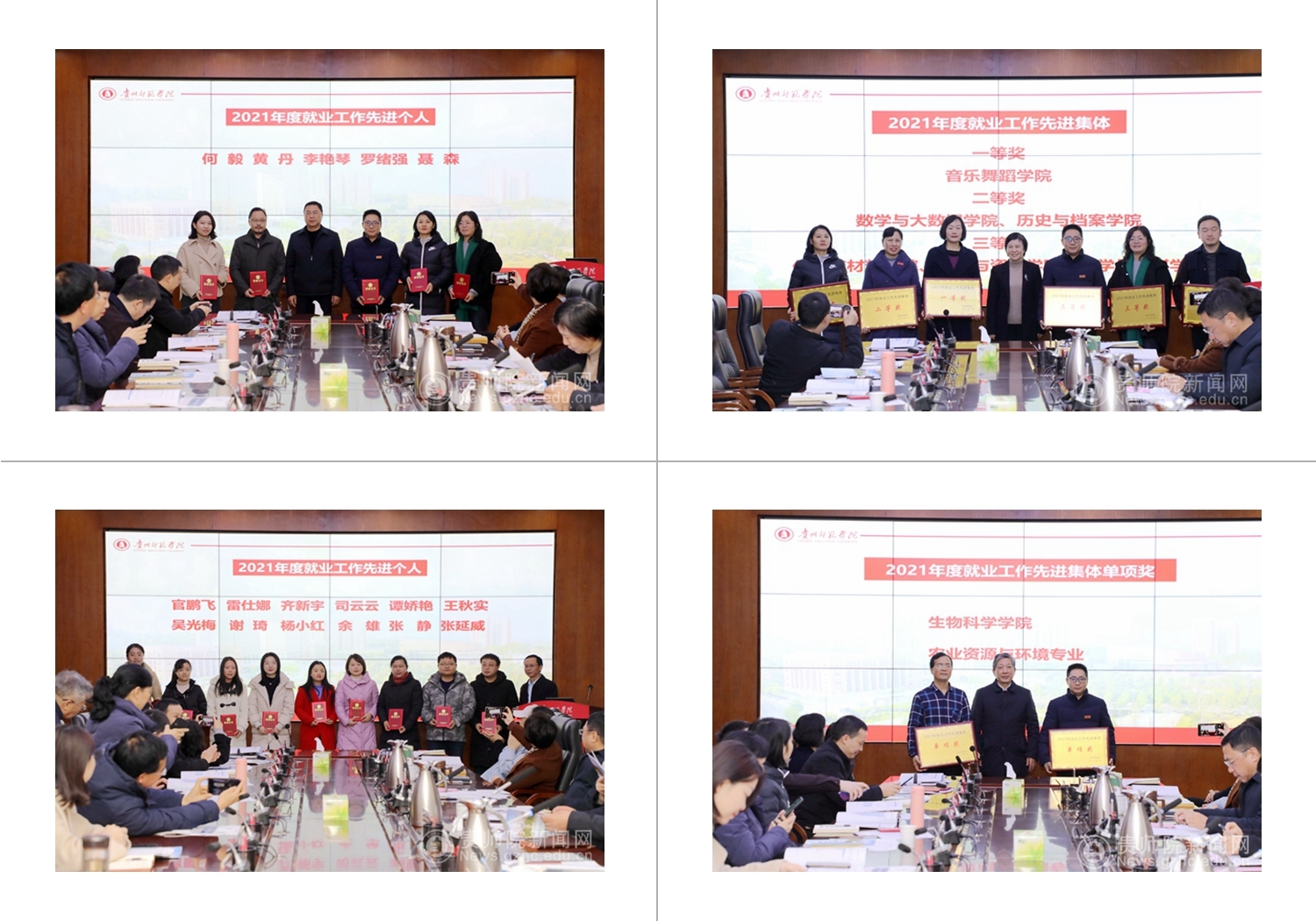 音乐舞蹈学院党委书记付巧、生物科学学院教师张廷威作了就业工作交流发言,全体校领导为音乐舞蹈学院等6个先进集体,何毅等17名就业工作先进个人以及生物科学学院等2个就业工作单项奖颁奖。