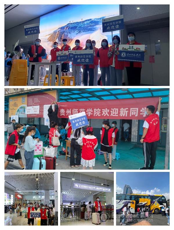 校外,迎着清晨的第一抹朝阳,志愿者们带好防护物资、引导牌前往金阳客车站、贵阳北站、贵阳东站和火车站等四个站点迎接新生入校。在志愿者的引导下,新生到登记点进行登记,前往候车区上车前往师院。在志愿者的指引和陪同下,新生如期到达师院,顺利完成报道。