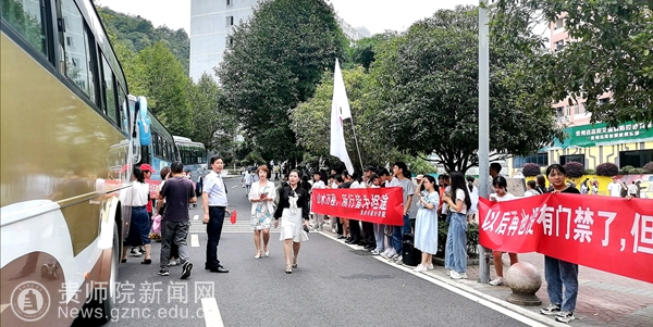 一枝一叶总关情,一点一滴见初心,学校贴心为离校的毕业生准备专车,开往火车站、客运站、高铁站,校文明督察队队员、各学院志愿者热情的为毕业生搬运行李。送别的师生深情唱着歌,送上鲜花、拉着横幅,相互拥抱,留下不舍的眼泪……中午1点,车辆缓缓出发,毕业生们载满收获、手捧鲜花、挥着双手,从移动的车窗中给恩师道别,回忆往昔的学习奋斗的岁月,更坚定了追求未来的璀璨梦想。