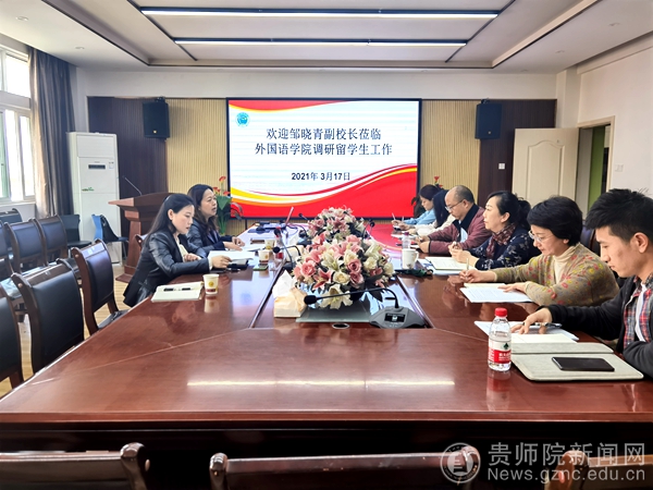 本网讯 3月17日下午,副校长邹晓青到外国语学院开展留学生管理专项工作调研, 对外交流合作处处长张瑶陪同调研。会议在外国语学院会议室举行,外国语学院党委书记谭定德、院长余学军及负责留学生工作的教师参加了本次会议。