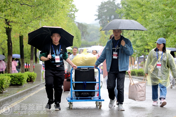 和往年不同的是,由于今年疫情的特殊情况,新生家长不能进入校园,学校在校门口贴心地为家长们设置了休息区,各部门各尽其职,认真细致、热情周到地为新生及家长做好解释和服务工作,展现了师院人最温暖的笑容。虽然今日天公不作美,阴雨绵绵,但师院人服务的热情高涨。志愿者们穿着雨衣撑着伞坚持在校门口迎接新生和家长,引导新生扫健康二维码、登记身份信息、进入校园,一辆辆来来往往托运行李的摆渡车成了今年校园里温暖的风景线。细心的学长学姐,醒目的路牌标识,凤凰广场设置的绿色通道、资助咨询、教务咨询、医疗救助、党团服务、校友交流等,校园里处处洋溢着迎新的喜悦与期待。灿烂的微笑、贴心的帮助、热情的接待、悉心的指导,新生及家长纷纷为学校有温度的迎新工作点赞。