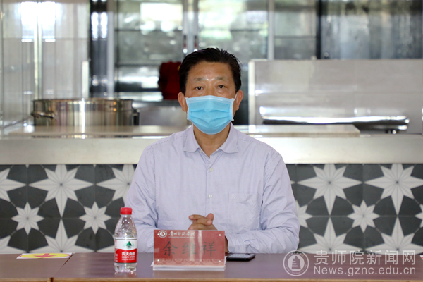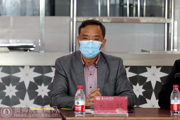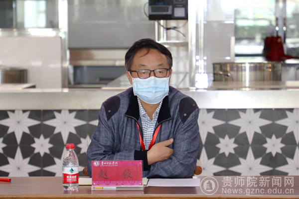 赵毅讲话,感谢乌当区市监局、高新分局领导同志们对pp电子后勤工作的支持和这段时间为学生返校复课所做工作的付出;他表示,所有食堂从业人员必须做核酸检测,持有效健康证才能上岗,入校通行证以核算检测为基础。
