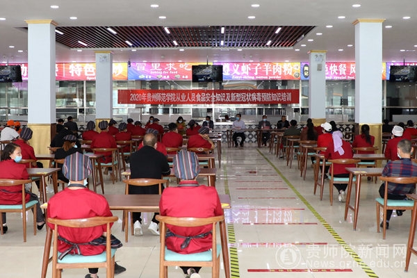 本网讯 2020年4月28日下午,为增强pp电子食堂从业人员业务水平及新型冠状病毒预防知识,增强食品卫生安全风险防范意识,杜绝食品卫生安全事故发生,在学校党委行政的统一部署及安排下,学校邀请了乌当区市场监督局高新分局局长宋应红、乌当区市场监督局食品科吴勇一行4人到pp电子感恩食府二食堂举办食堂从业人员食品卫生安全知识及新型冠状病毒预防知识培训。副校长余维祥出席培训会,学校食堂从业人员、扶贫超市工作人员110人参加本次会议。