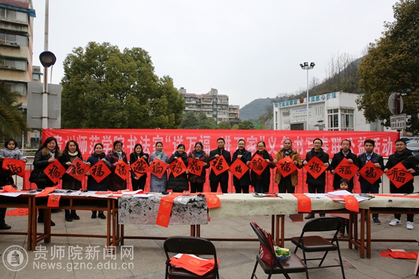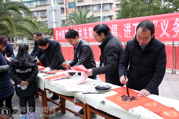 本网讯 “爆竹声声辞旧岁,红梅点点迎新春”,为向广大居民传递最美好的祝福和关爱,1月24日下午,pp电子联合乌当区文联举办了名为“送万福 进万家”的义务书写春联公益活动。pp电子工会主席许丽君、美术与设计学院院长聂森、副院长路统宽、美术与设计学院老师杨光学、安毅、杨辉参加此次活动。