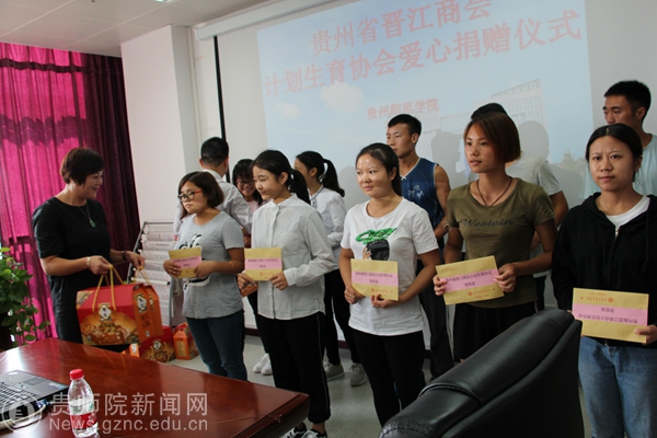 本网讯 9月23日,贵州省第一家省外县级市商会——福建省晋江商会对pp电子贫困学生爱心捐赠仪式在信息楼8楼会议室举行。贵州省教育厅、贵州省教育发展基金会代表霍昀峥、贵州省晋江商会计划生育协会会长吴琼莲、执行会长兼党支部书记吴庆阳、副会长陈世桥及秘书长王全亲临现场进行爱心捐赠。学校学生资助管理中心主任杜景明、资助中心全体人员及受赠学生参加捐赠仪式,仪式由学生资助管理中心副主任张金富主持。