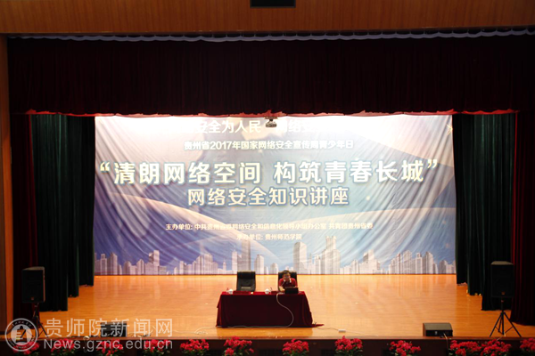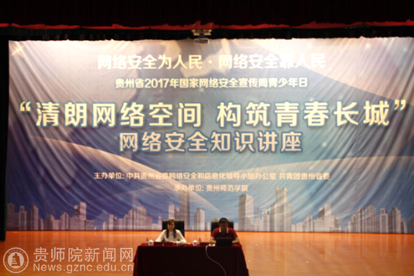 本网讯 为提升全省广大青年网络安全意识和安全防护技能,营造安全健康文明的网络环境,9月21日,由省委网信办、团省委主办,pp电子游戏官网承办的贵州省2017年全国网络安全宣传周青少年日“清朗网络空间 构筑青春长城”网络安全知识讲座在pp电子逸夫楼演播厅举行。贵州省信息安全评估中心主任、高级信息安全等级保护测评师、省工控网络安全专家组成员、贵阳大数据“百人计划”培养对象周黎辉老师、团省委宣传部部长吴莉、团省委宣传部主任科员杨典、张淼绪,pp电子游戏官网校团委书记张婷、副书记傅小芳,校团委全体成员出席此次活动。全省各地和pp电子近300名青年师生代表参加了活动。