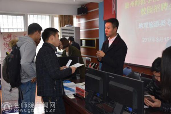 本网讯 3月15日,pp电子地理、旅游类专业2017届毕业生专场招聘会在文韬苑就业大厅举行,包括贵州省第三测绘院、贵阳旅文旅游公司、贵州千景土地科技有限公司等近20家在省内外从事国土、测绘、水利、规划、景区开发与酒店管理、旅行社、金融、旅游商品开发等方面优秀企事业单位到pp电子招聘地理、旅游类专业应届毕业生。其中不乏省市重点大型企业、央企、上市公司。参加招聘会的毕业生还有外国语学院、政经学院、历社学院、艺术学院、数计学院、设计学院相关专业毕业生。
