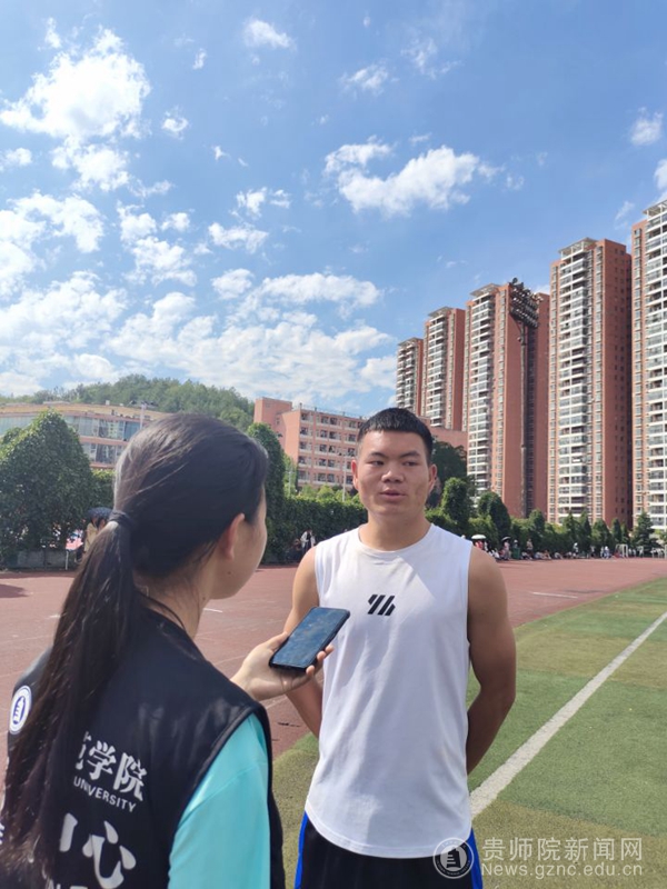 体育学院20级的熊超参加了男子铅球比赛,赛前他的手受了伤,不过凭借自身的基础和过硬的专业素养,熊超还是能自如地投掷铅球。当被问及扔铅球有什么技巧时,熊超回答道:“没有什么技巧,就是靠多练习,手上的茧子多了就慢慢掌握技巧了。”投掷铅球时,他的动作一气呵成,手握沉重的铅球经过几个标准转体就把它掷出一道优美的弧线,可见平时所用功夫之深。数学与大数据学院18级信息工程专业的杨震是男子400米比赛的参赛选手,他说:“平时就常常锻炼,为了参加400米,赛前就经常练习,常常大汗淋漓的回寝室。”