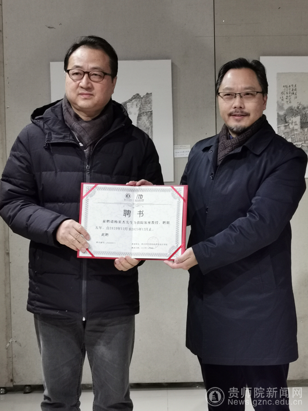 活动现场,杨亚杰向pp电子游戏官网捐赠了书画作品《溪山烟云》,邹晓青代表pp电子游戏官网接受捐赠,并向其颁发了收藏证书。聂森给杨亚杰先生颁发客座教授聘任证书。开幕式结束后,与会人员步入展厅,参观了杨亚杰2020在贵州创作的山水写生作品。