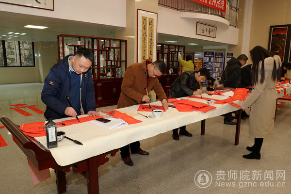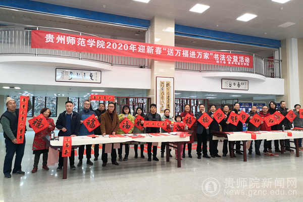 本网讯“无联不成春,有联春更浓”。为迎接新春佳节、弘扬传统文化,1月11日上午,校工会、美术与设计学院在校图书馆一楼大厅联合开展了“送万福进万家”书法公益活动,现场为教职工群众送上新年的祝福。校工会主席许丽君、美术与设计学院党委书记石含洲、院长聂森、党委副书记赵玉、美术与设计学院老师白瑞荣、杨光学、安毅、杨辉、美术与设计学院学生张家瑜参加此次活动。