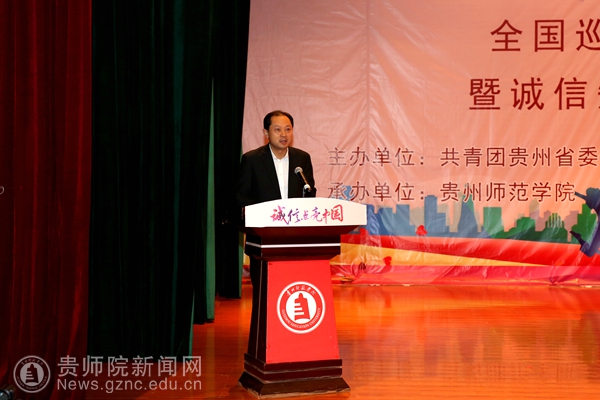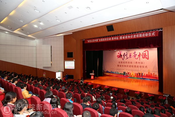 石培新的致辞中,首先代表学校对各位领导、嘉宾的到来表示热烈欢迎,对“诚信点亮中国”全国巡回活动(贵州站)暨诚信知识进校园启动仪式的隆重召开表示热烈祝贺,他指出,青年要成为诚信建设的主力军,高校要围绕立德树人根本任务,发挥多学科优势推进诚信社会建设。学校要抓住“青年信用建设研究基地”挂牌的契机,主动与各部门探索产教结合模式,建立教学实践基地,加强征信知识科研研究,加大信用专业人才培养,与各部门一起推进大学生诚信教育工作,信用风险教育活动开展,促进信用知识和诚信文化在校园的传播和普及。