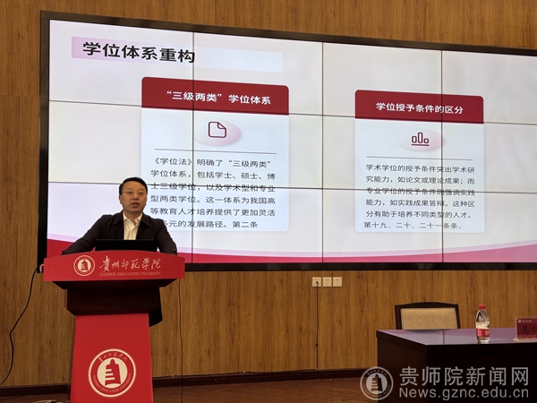 本网讯 为深入学习贯彻《中华人民共和国学位法》(以下简称《学位法》),进一步提升pp电子学位工作的规范化、法治化水平,全面提高人才培养质量,4月1日下午,pp电子邀请贵州师范大学法学院教师、法学博士、硕士研究生导师、贵州省教育厅法律顾问吴旭梦作《学位法》解读专题讲座。各学院负责人、校学士学位评定委员会成员、各学院学士学位分委员会成员、教务处、研究生院、继续教育学院学位管理人员等参加讲座。讲座由校党委委员、副校长潘运主持。