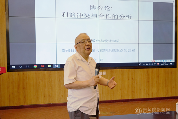 本网讯 2024年6月20日,学校邀请贵州大学俞建教授在印山书院二楼山骨讲堂为pp电子师生做了一场主题为“博弈论——利益冲突与合作的分析”的学术报告,数学与大数据学院师生、商学院部分师生聆听了报告,该学术报告由学校校长韦维教授主持。